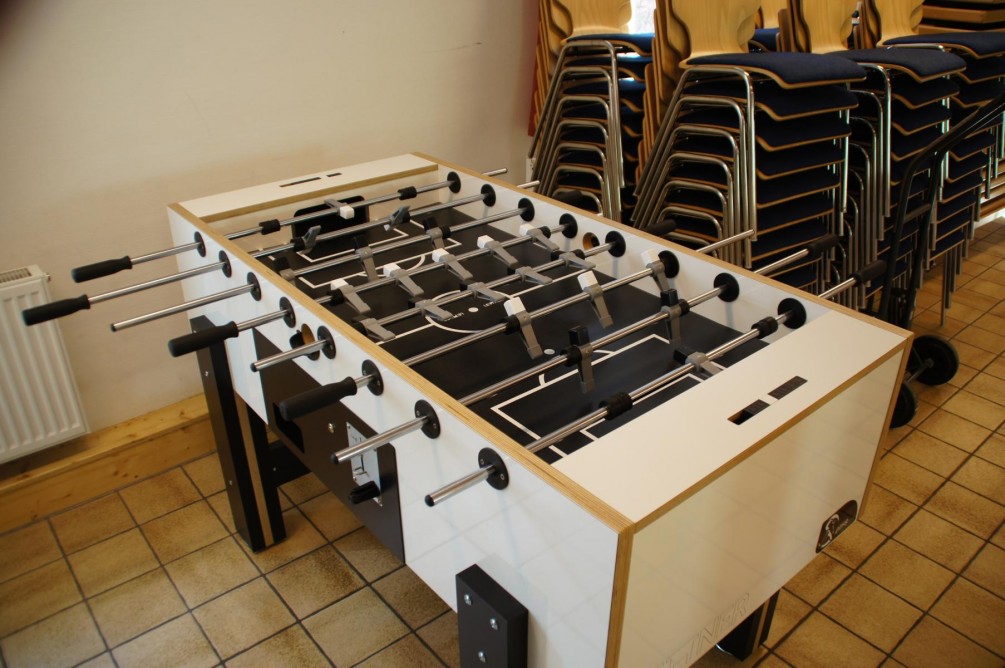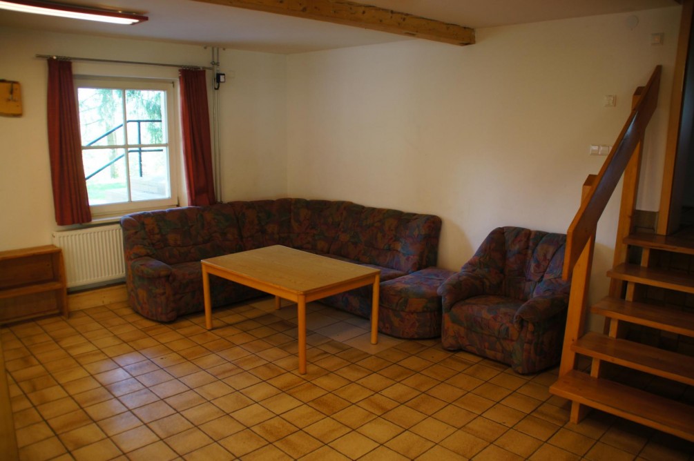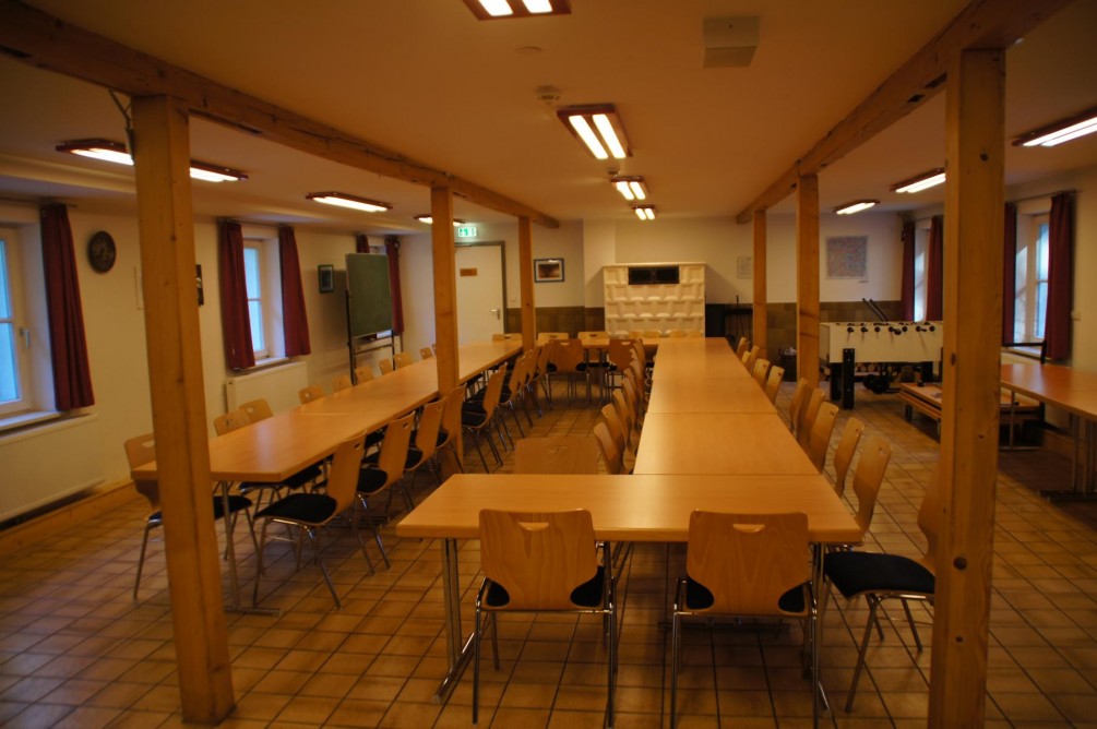 Der 110 qm große Aufenthaltsraum/Saal bietet ausreichend Platz, selbst für große Gruppen. Stühle und Tische können je nach Wunsch aufgebaut werden, insgesamt stehen ca. 60 Sitzplätze zur Verfügung. Ein professioneller Tischkicker lädt zu spannenden Duellen ein. Des Weiteren gibt es eine Leinwand. Zusätzlich zu der Zentralheizung gibt es einen Kachelofen, Brennholz ist genügend vorhanden. WLAN ist auf Wunsch kostenfrei verfügbar.