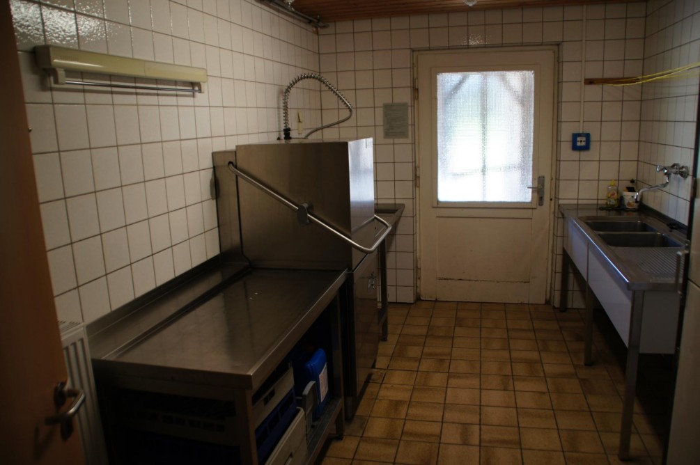 In der daneben liegenden Spülküche befindet sich Geschirr für ca. 60 Personen und eine Industriespülmaschine.