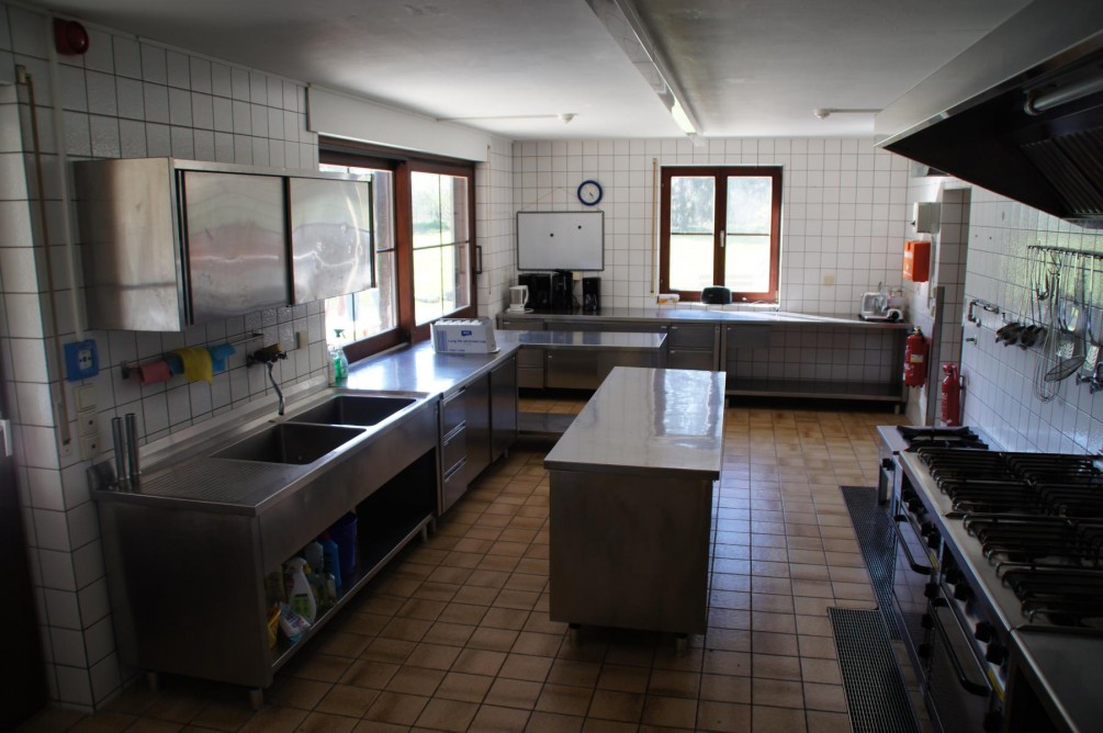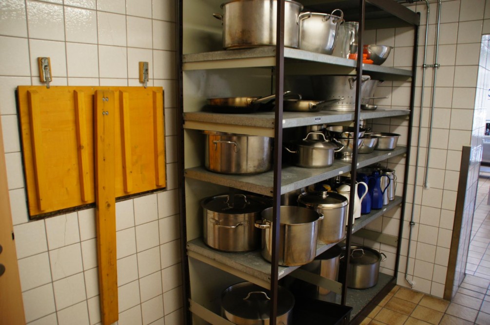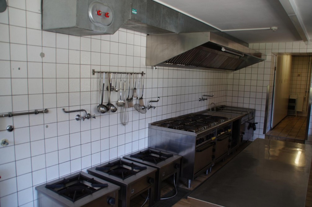 Die Großküche ist mit 2 Backöfen, 3 Hockerkochern und insgesamt 8 weiteren Gaskochstellen ausgestattet. Daneben bietet die Kippbratpfanne die Option, im „ganz großen Stil“ zu braten.
